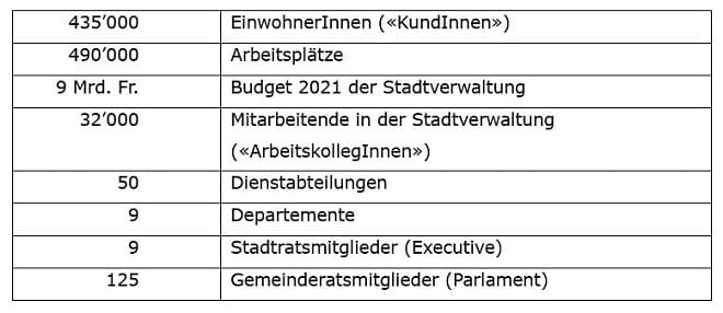 Bei 32'000 Mitarbeitenden, die auf neun Departemente aufgeteilt sind, kennt man zu Beginn eines Projektes die KollegInnen meist nicht. Dabei ist der Projektstab Stadtrat mit 10 Jahren noch relativ jung und hat gerade mal fünf Mitarbeitende (Abb. 2).