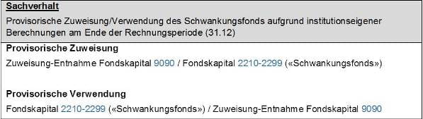 Ein vollständiges Buchungsschema, in dem u.a. auch die Sicht eines OR-Anwenders, eine Praktiker-Methode sowie die Verwendung des Schwankungsfonds für Investitionen vorgeschlagen werden, ist in der Publikation «Der Schwankungsfonds – Finanzierung sozialer Einrichtungen im Umbruch» ersichtlich.