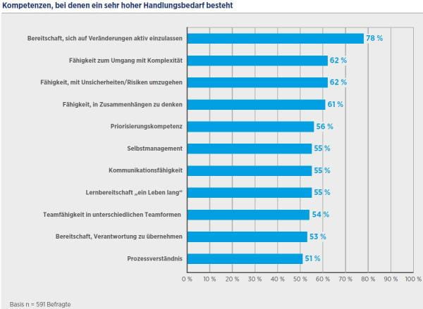 Neben IT-Expertise, technologischem Know-how und Medienkompetenz gelten gemäss einer von Hays durchgeführten Studie(2) vor allem Soft Skills als unerlässliche Kompetenzen für die neue Arbeitswelt: Mit Abstand als wichtigste Fähigkeit erweist sich die Bereitschaft, sich auf Veränderungen aktiv einzulassen. Relevant sind auch Fähigkeiten im Umgang mit Komplexität, Unsicherheiten und Risiken. In Zusammenhängen denken, die richtigen Prioritäten setzen zu können sowie ein gutes Selbstmanagement und Kommunikationsfähigkeiten gehören ebenso zu den geforderten Kompetenzen. Ferner braucht es eine „lebenslange“ Lernbereitschaft sowie die Fähigkeit, in unterschiedlichen Teamformen zu arbeiten und Verantwortung zu übernehmen. Auch ein Verständnis für Prozesse darf nicht fehlen.