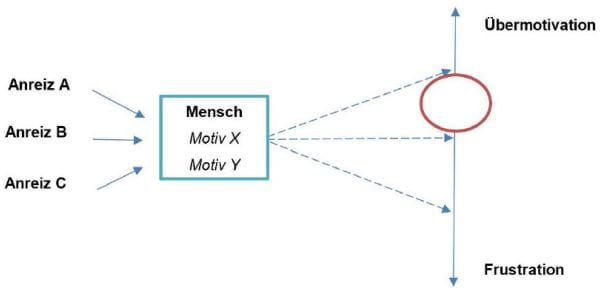 Ausserdem müssen Unternehmen darauf achten, dass es bei den Mitarbeitenden nicht zu übermässiger Motivation durch ein zu hohes Mass an Anreizen kommt. Merkmale einer solchen Überreizung sind beispielsweise extremer Arbeitseifer und sehr starkes Interesse, die aber Begleiterscheinungen wie Hektik und Nervosität mit sich bringen, welche zu Fehlern und vorschnellen Entscheidungen führen können. Unternehmen sollten also versuchen, das ideale Mass an Anreizen für ihre Mitarbeitenden zu finden, damit sich diese immer in einem motivierten aber nicht in einem über- oder demotivierten Zustand befinden (siehe Abbildung roter Kreis).
