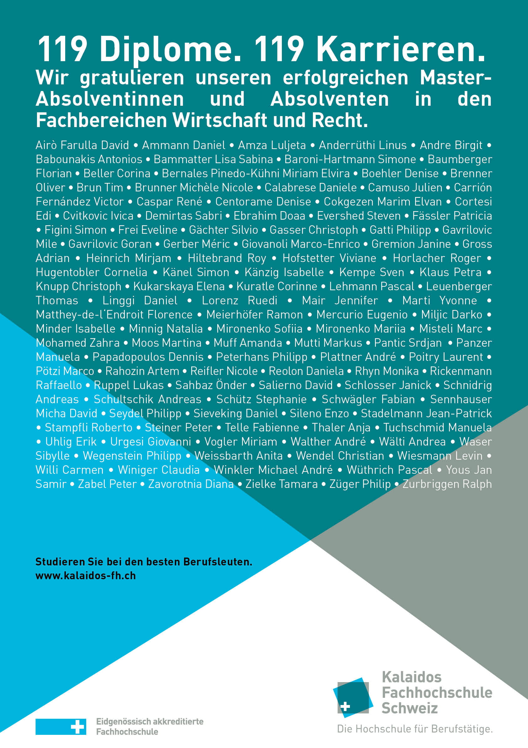 Das Team der Kalaidos Fachhochschule gratuliert allen Absolventinnen und Absolventen herzlich und wünscht ihnen viel Freude und Erfolg beim Anwenden des Gelernten.